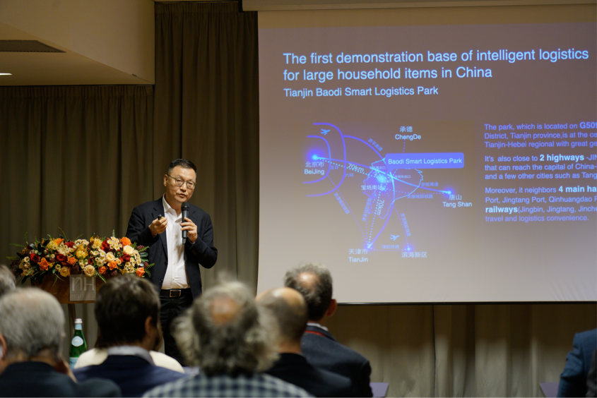 居然之家智慧物联总经理杨明分享了天津宝坻智慧物流园和长春智慧物流园的建设及运营近况,并详细介绍了如何通过与“天网”洞窝和“地网”到家服务的融合,为进口家居品牌提供有力的服务保障。