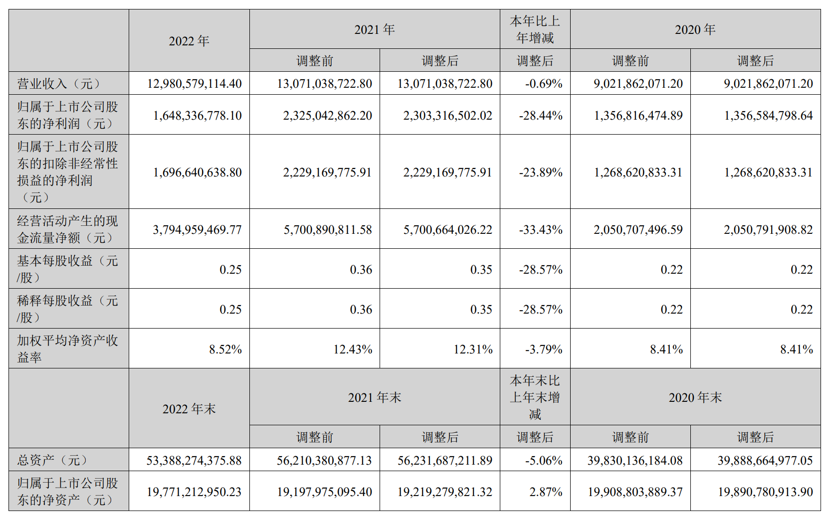 公告显示,2022年公司实现营业收入129.81亿元,同比减少0.69%;实现净利润17.21亿元,同比下降27.64%。