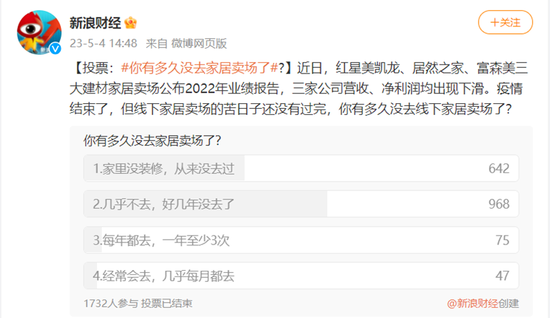 与此同时,消费者们对于线下卖场的态度,也正在发生着改变。在一项由新浪财经发起的投票中,1732人参与的投票中,968人表示已经好几年没有去过家居卖场,占比高达56%;每年至少三次及更多的人员,占比仅7%。