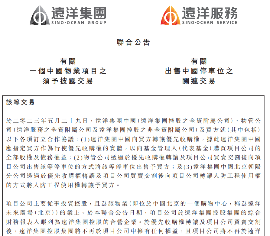 2023年5月29日晚间,远洋集团、远洋服务在港交所披露,远洋集团全资子公司远洋集团中国将以3.59亿元人民币出售远洋未来广场(北京),估计远洋集团将就该交易确认税前净收益约3.16亿元人民币,拟将出售所得款用于补充营运资金。