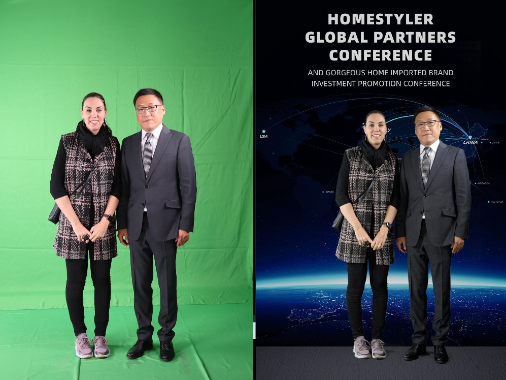 米兰国际家具展国际部主任Monica Molinari(图左),与居然设计家总经理许敏(图右),通过3D换景直播技术进行签到处3D合影。