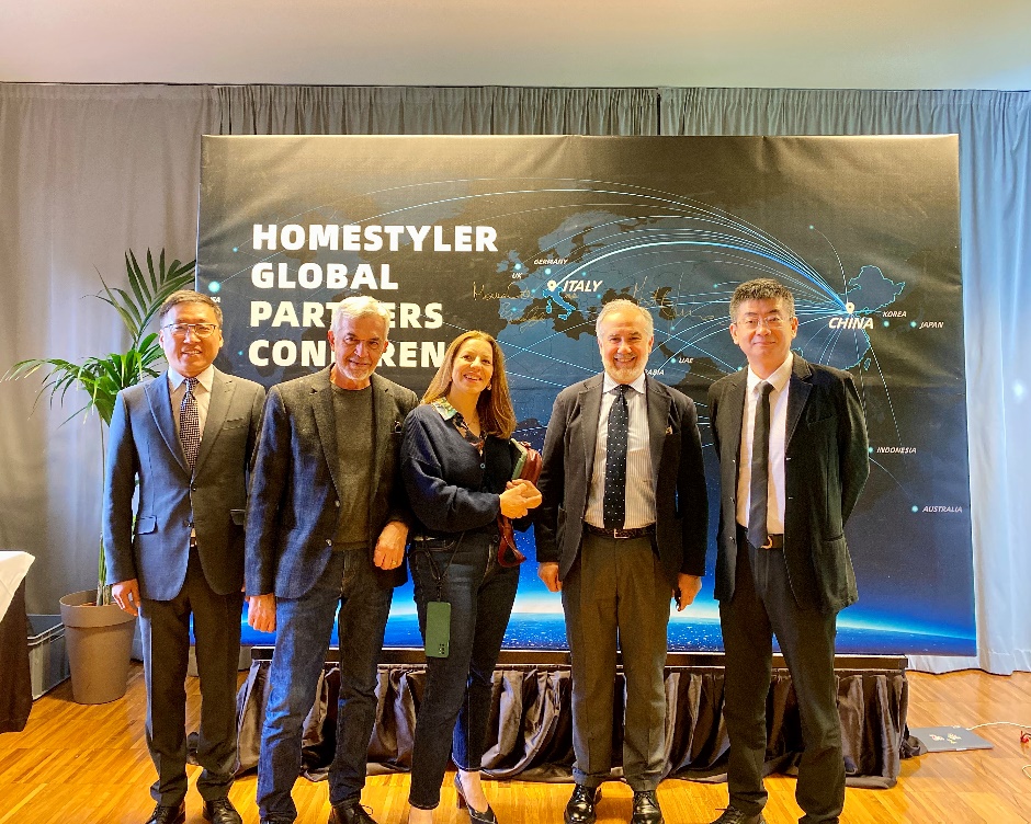 居然之家执行总裁王宁(右一),米兰理工大学 POLI.design设计学院原校董会主席、设计学院校企合作负责人Matteo Ingaramo(右二),Homestyler意大利资深设计师用户(左二、左三),居然设计家总经理许敏(左一),在发布会现场