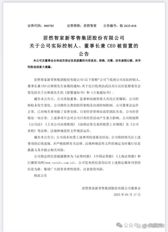 4月17日,居然智家(000785.SZ)公告称,公司收到实际控制人、董事长兼CEO汪林朋家属的通知,其于近日收到由武汉市江汉区监察委员会签发的关于汪林朋的《留置通知书》和《立案通知书》。
