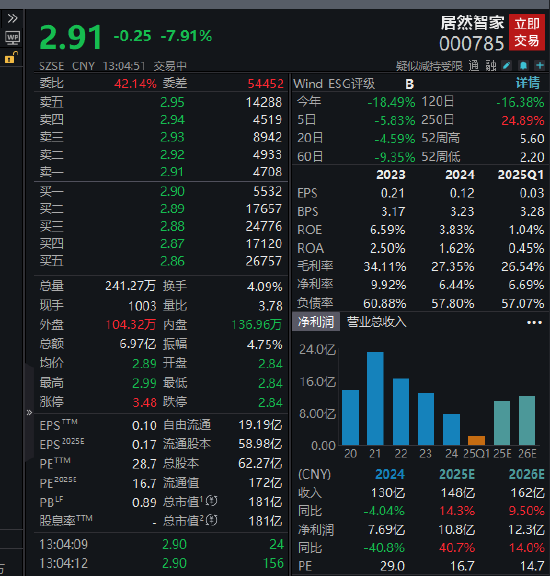 7月28日,居然智家(000785.SZ)开盘即遭重挫,股价一度封死跌停板。截至发稿时,股价报2.91元,暴跌7.91%,总市值蒸发超15亿元,仅剩182亿元。这场资本风暴的导火索,是前一日传出的惊人消息——公司董事长兼实际控制人汪林朋于7月27日上午坠楼身亡,享年57岁。