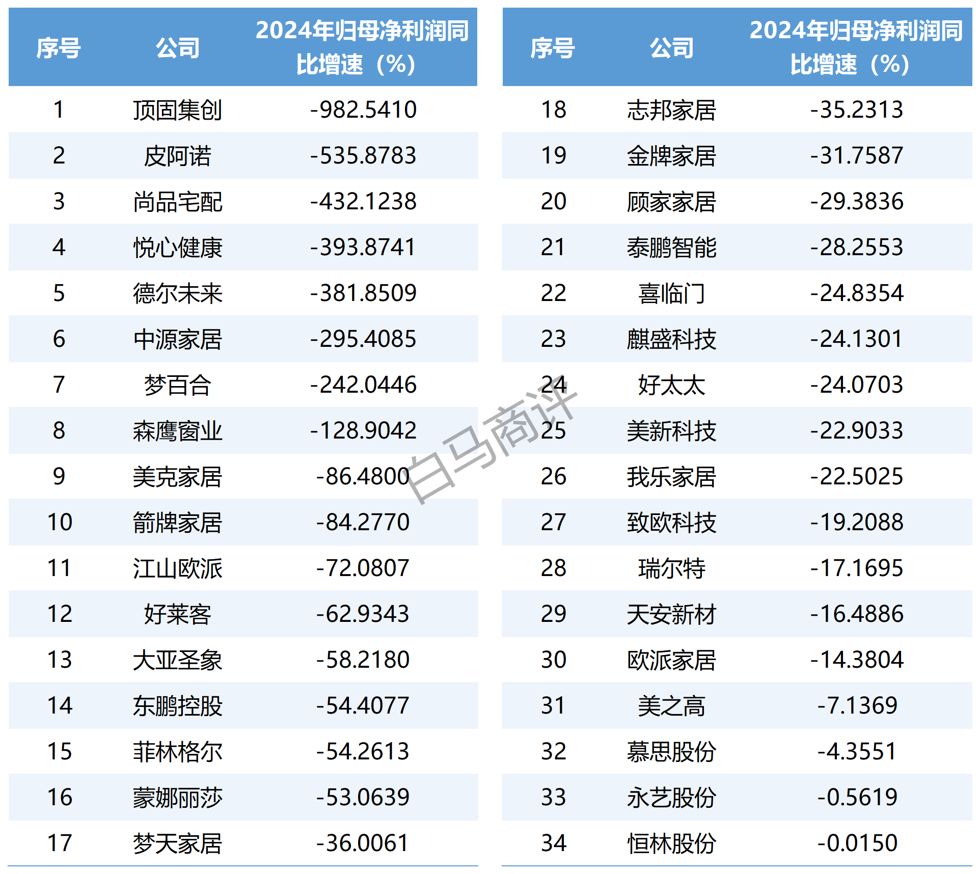 在A股上市的50家家居用品公司(不含其他家居用品)中,15家公司2024年归母净利润为亏损状态,34家公司增速同比下滑。