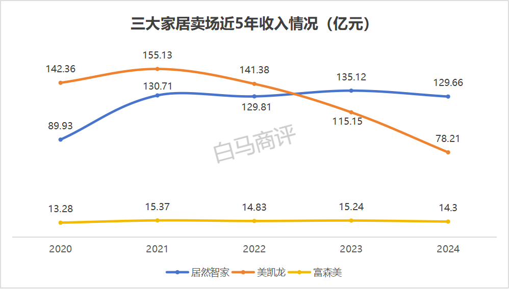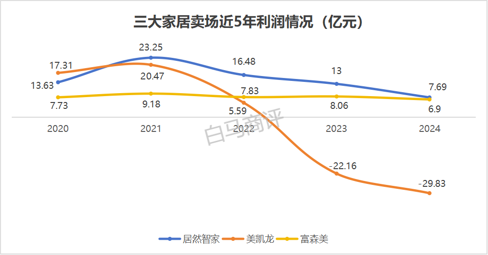居然智家、富森美收入四年止步不前;红星美凯龙更是连续3年下滑,2024年收入仅为5年前的一半多。与此同时,利润节节下滑,2024年居然智家归母净利润7.69亿元,同比下降40.83%,美凯龙更是大幅亏损。
