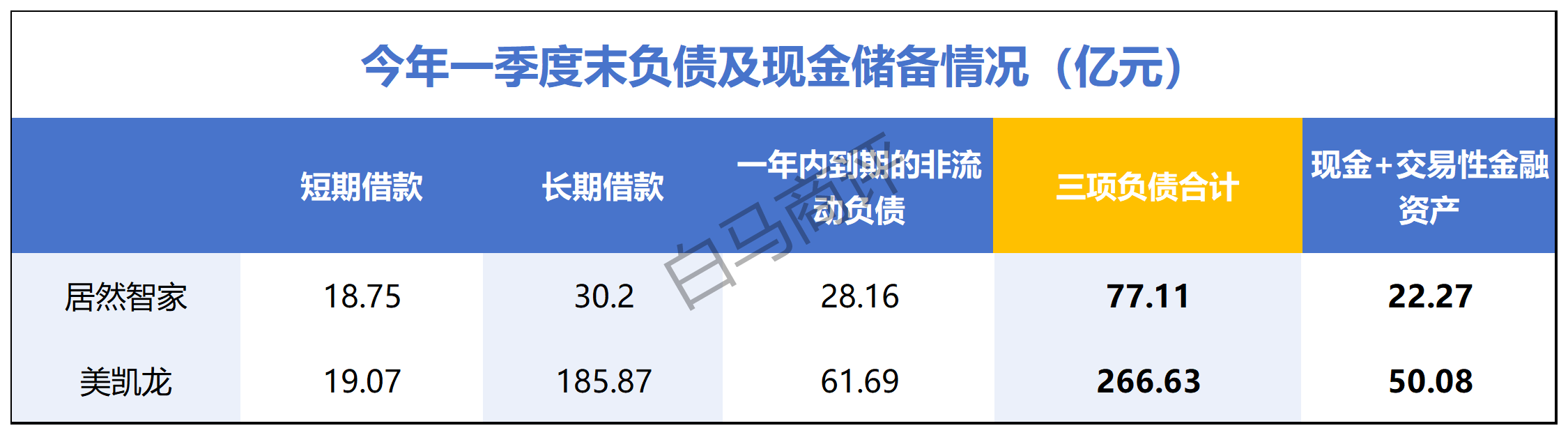 今年一季度末,居然智家短期借款、长期借款、一年内到期的非流动负债三项合计为77.11亿元,账上现金和交易性金融资产合计仅为22.27亿元,缺口超过50亿元;美凯龙三项负债合计266.63亿元,现金及交易性金融资产合计50.08亿元,缺口更是超过200亿元。