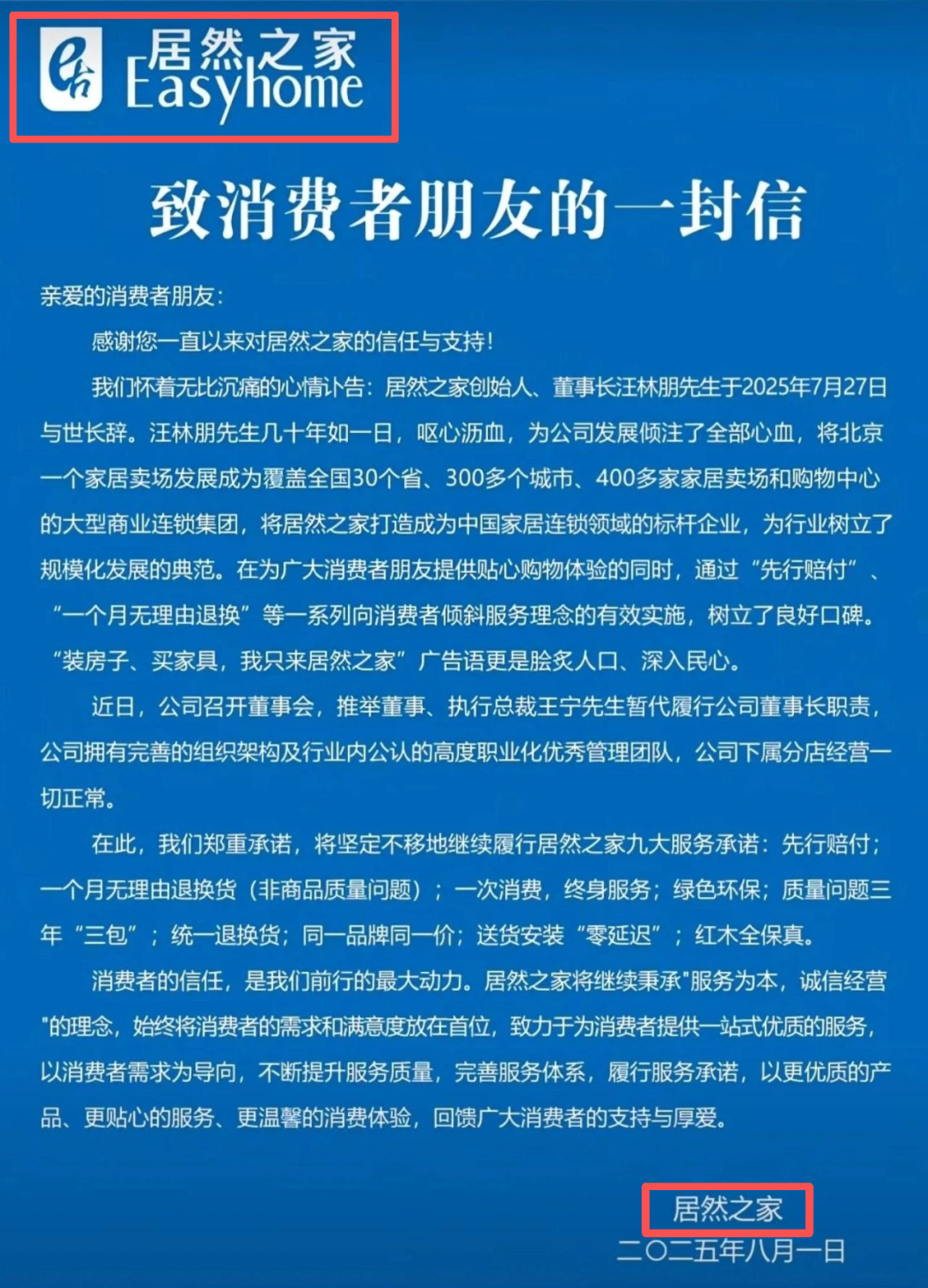 ▲居然之家8月1日发布《致消费者朋友的一封信》。