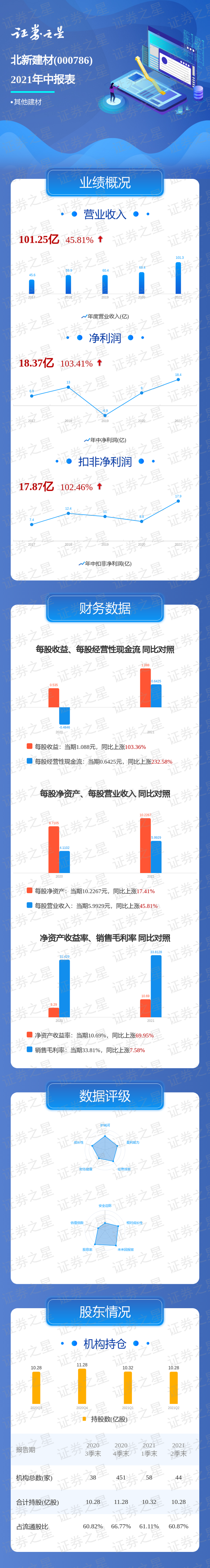 证券之星数据中心讯,北新建材2021中报显示,公司主营收入101.25亿元,同比上升45.81%;归母净利润18.37亿元,同比上升103.41%;扣非净利润17.87亿元,同比上升102.46%;负债率29.18%,投资收益484.69万元,财务费用3543.66万元,毛利率33.81%。