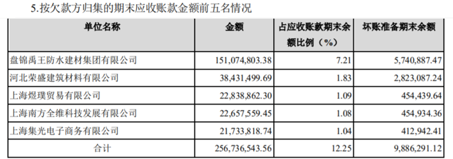 按欠款方归集的期末应收账款金额前五名,分别为盘锦禹王防水建材集团有限公司、河北荣盛建筑材料有限公司、上海煜璞贸易有限公司、上海南方全维科技发展有限公司、上海集光电子商务有限公司。
