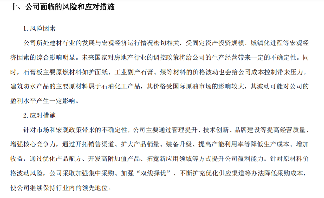 尽管营收双升,但地产行业低迷还是带来一些影响。北新建材在三季报中透露:因在结构钢骨项目建设过程中,房地产行业的发展具有较大的不确定性,结构钢骨行业面临的市场环境也随之发生了较大的变化,结构钢骨市场发展速度低于公司预期,市场容量不能满足公司新增产能的需求,继续该项目的投资已不符合企业的利益。本着效益最大化和股东利益最大化的原则,公司决定聚焦优势资源做大做强做优以石膏板为主的核心新型建材产品,将原有的天津、武汉、广安、肇庆、铁岭、枣庄、苏州共7个结构钢骨建设项目变更为吉安、富平2个建材基地建设项目并将剩余募集资金永久补充公司流动资金。新募投项目将为提升公司主营的石膏板业务的市场竞争力贡献力量,能够使公司进一步聚焦主业,使公司的石膏板产能规模和市场占有率进一步扩大。