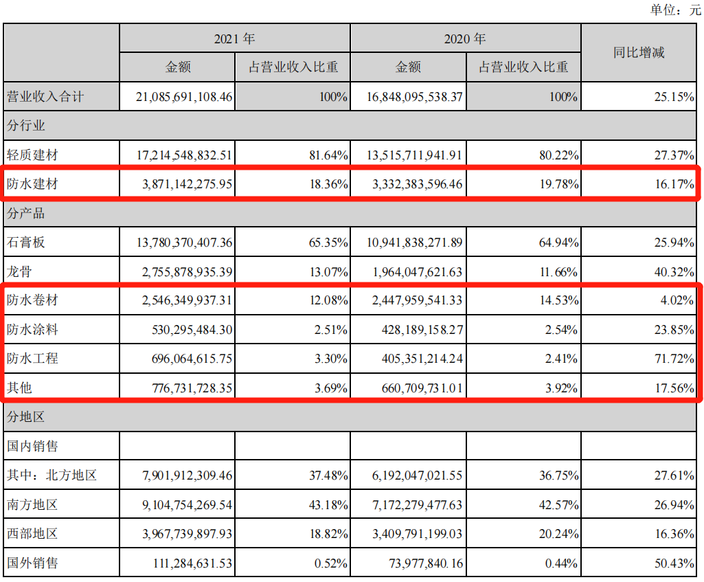 北新建材于2019年通过联合重组进入防水材料业务领域,去年又投资成立北新防水于,目前已推进15个防水材料生产基地布局,将组建“1+N”的防水产业格局,研发打造“北新”防水品牌,同时在专业市场和业务领域打造N个独立品牌。2021年并表防水业务营业收入为38.71亿元(同比增长16.17%),占公司营业收入的18.36%(防水收入中未包括上海台安2021年1月到4月收入、天津澳泰2021全年收入、成都赛特2021全年收入)。