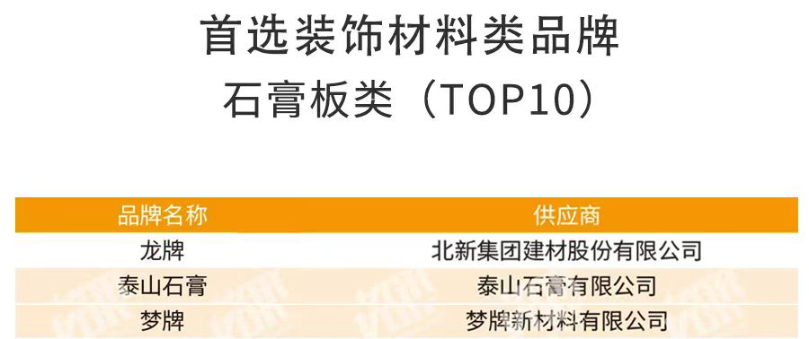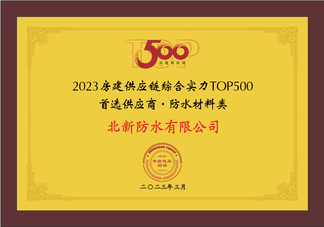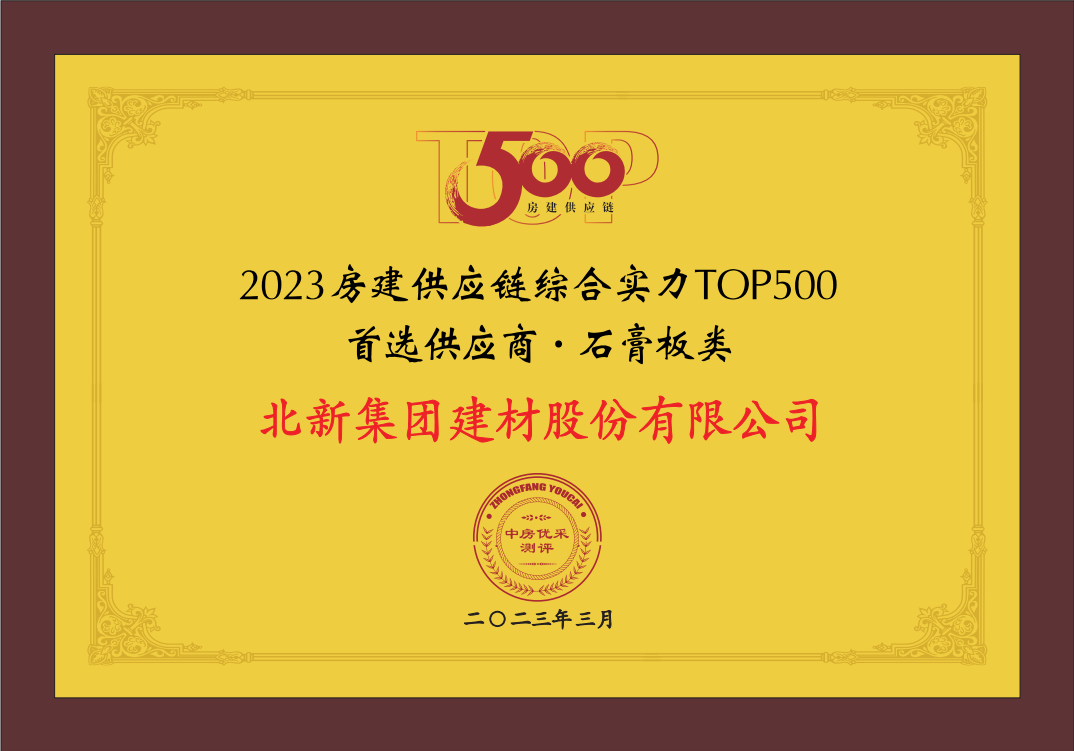 3月23日,2023中国房地产TOP500测评成果发布会暨房地产企业500强高峰论坛在京召开。会上发布了“2023房建供应链综合实力TOP500”等榜单,北新建材“一体两翼”全产品同时上榜。北新建材、泰山石膏、梦牌新材料,北新防水,北新涂料分别荣获石膏板类、防水材料类、涂料类“2023房建供应链综合实力TOP500首选供应商”,并入选中国房地产业协会供应链大数据中心“5A供应商”企业库。“龙牌”“泰山石膏”“梦牌”上榜首选装饰材料类品牌石膏板类前十;“北新防水”上榜首选土建材料类品牌防水材料类前三,同时位列光伏屋面防水系统类榜单前五;“北新涂料”上榜首选土建材料类品牌涂料类(全品类)前十。