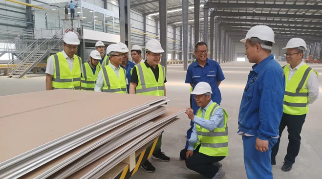 尹自波一行调研了中亚北新石膏板生产线试机情况,详细听取了工作汇报,并对中亚北新项目建设取得的进展和成绩给予肯定。他表示,北新建材的国际化不仅是石膏板业务的国际化,还要打造多元产品的国际化,把北新建材打造成为国际化新型建材企业。作为北新建材在海外的第二个生产基地,中亚北新要做“一带一路”倡议的坚定拥护者和积极践行者,不断发展壮大,成为北新建材走向国际化的一张靓丽名片。对于坚定不移加快推进国际化,以及中亚北新进一步做好项目投产运营,他提出四点要求: