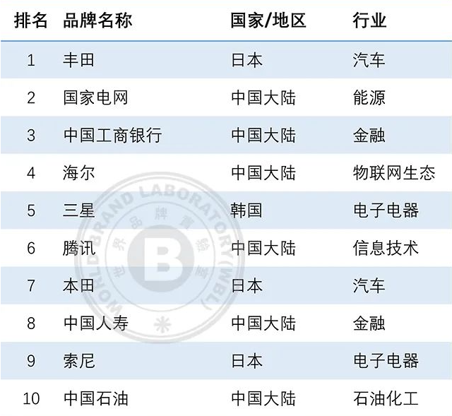本次发布的榜单,丰田、国家电网、中国工商银行名列前三,占据榜单前十名的还有海尔、三星、腾讯、本田、中国人寿、索尼和中国石油。中国、日本和韩国是入选品牌最多的三个国家。