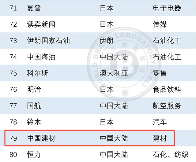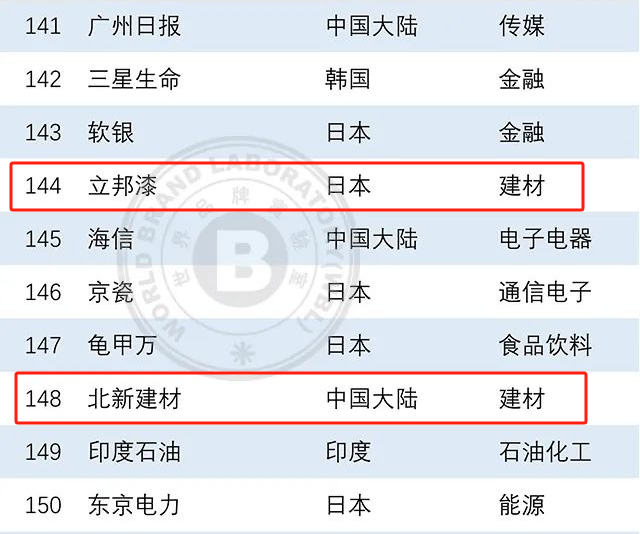 本次发布的榜单,小编留意到,中国建材位列榜单第79位,较去年上升2位;立邦漆位列榜单第144位,较去年上升3位;北新建材位列榜单第148位,较去年上升2位。