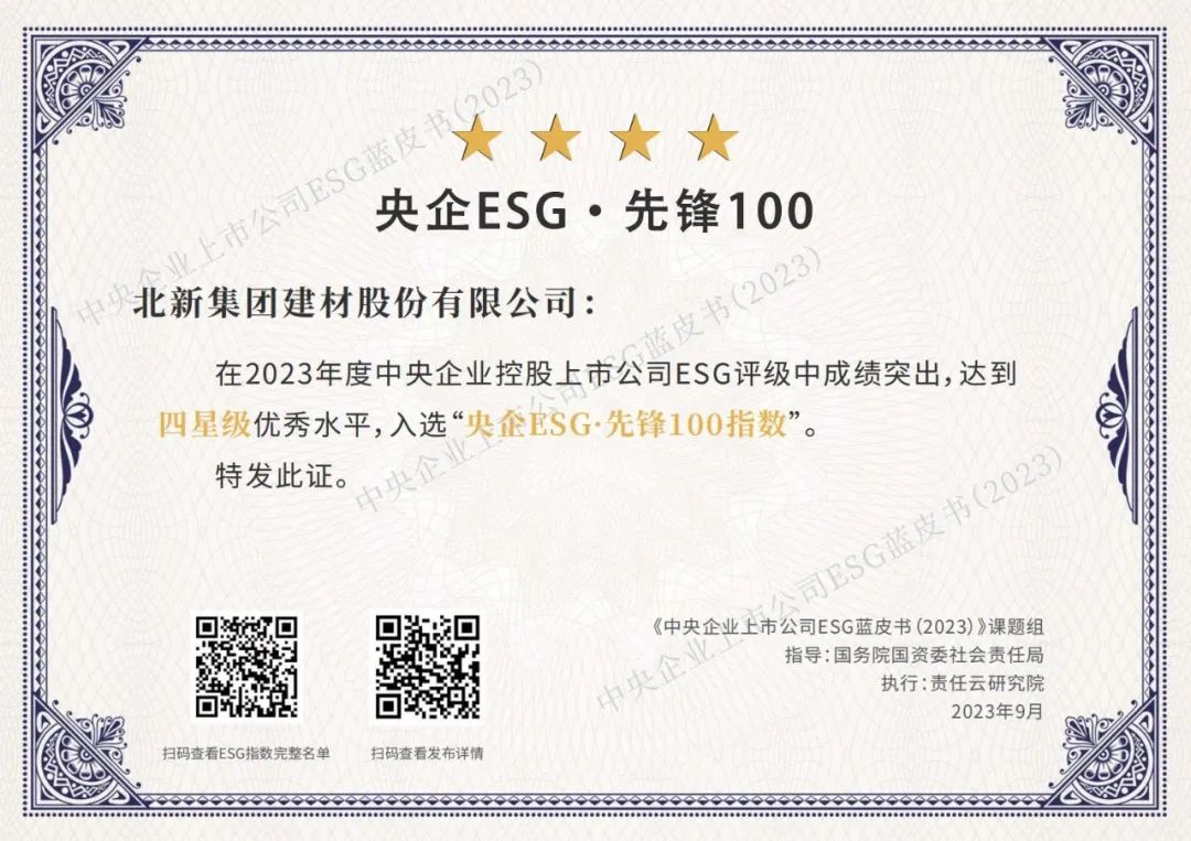 9月23日,由国务院国资委社会责任局指导,中国社会责任百人论坛承办的中央企业ESG论坛在山东济南召开。会议正式发布了“央企ESG·先锋100”指数,北新建材成绩突出,达到四星级优秀水平,位列第87位。