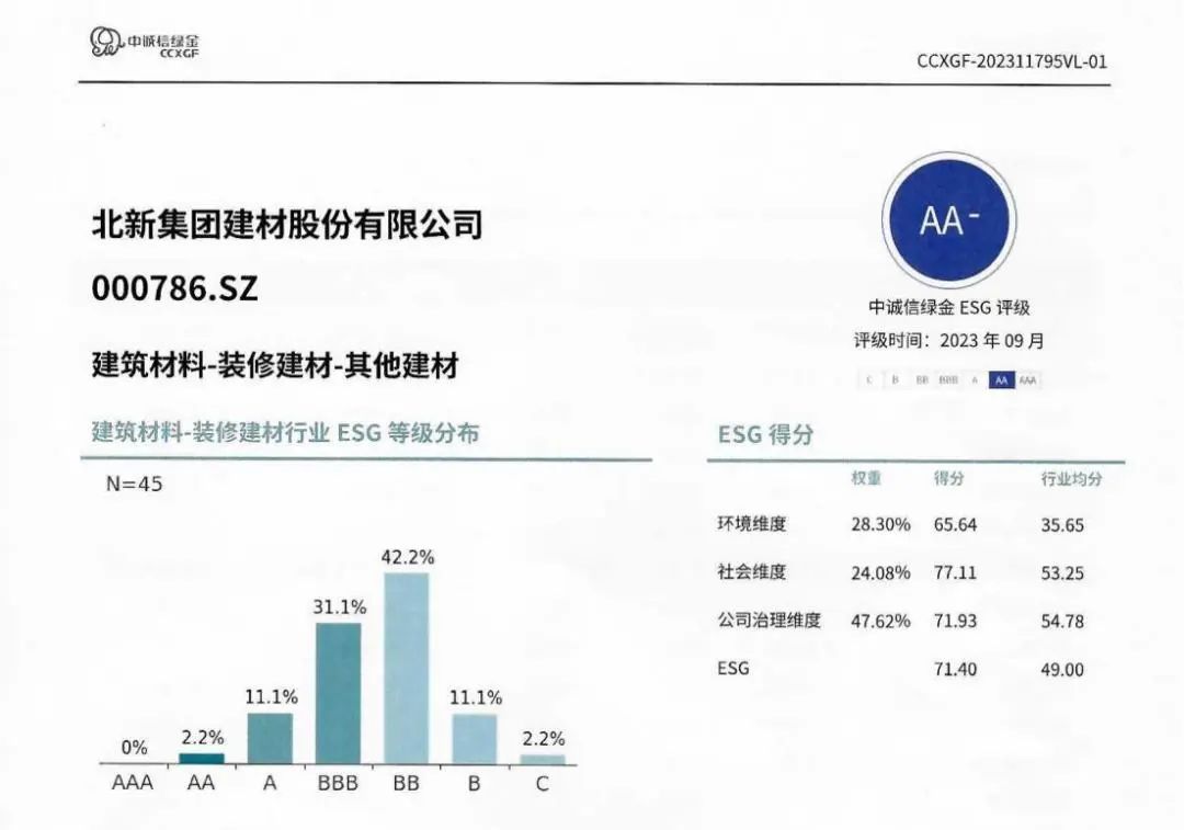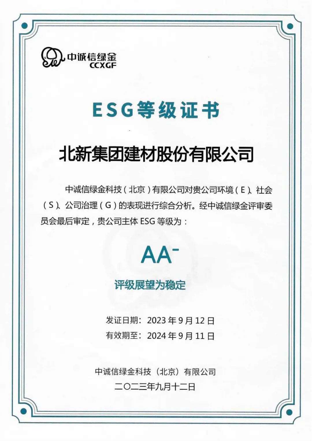 近日,中诚信绿金发布北新建材2023年度ESG评级报告,北新建材ESG评级结果为AA-,突显出公司具有较大可持续发展潜力,有助于提高公司竞争力,并赢得投资者和利益相关方的信任。