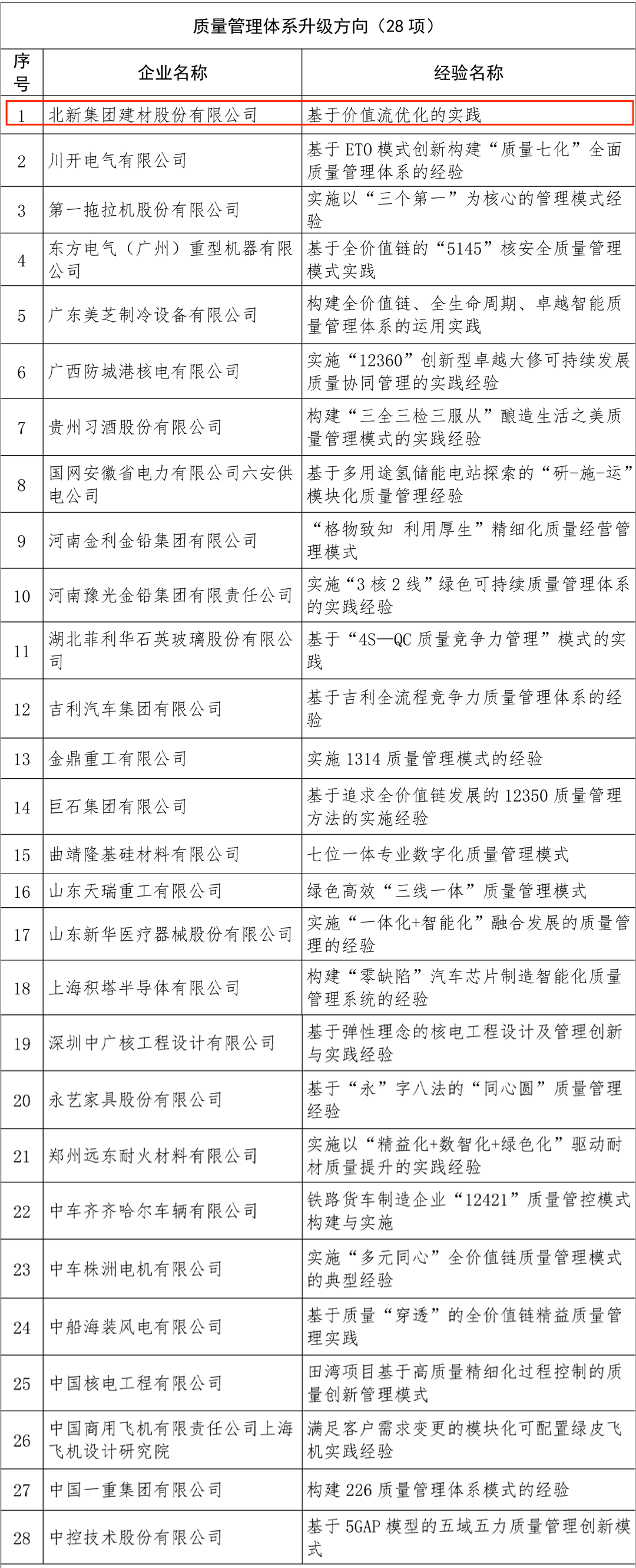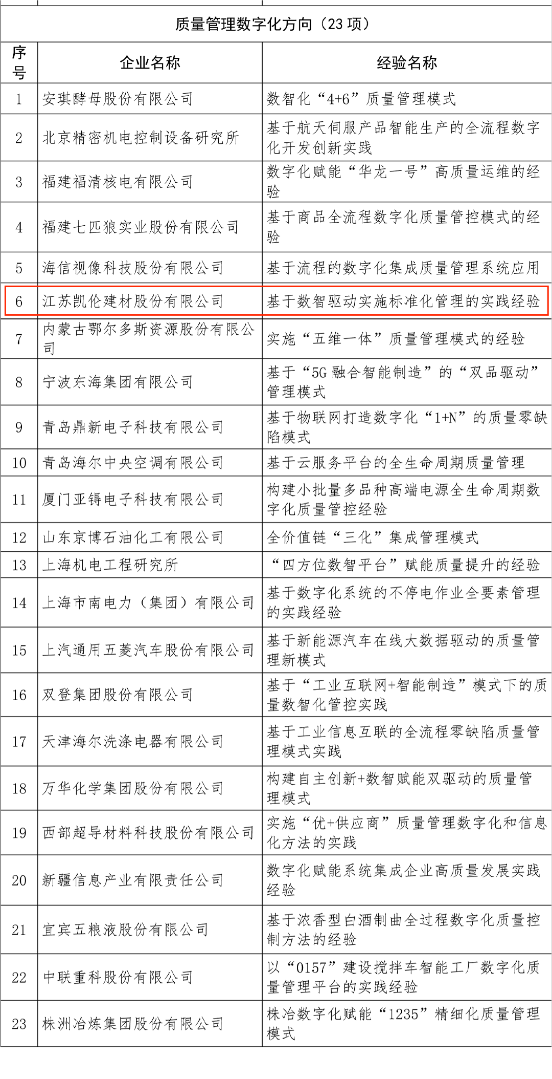 慧正资讯:近日,由工信部主导、中国质量协会组织评选的2023年全国质量标杆典型经验遴选结果公布,全国共有69项典型经验入选。其中,北新集团建材股份有限公司(简称“北新建材”)和江苏凯伦建材股份有限公司(简称“凯伦股份”)的“基于价值流化的实践”和“基于数智驱动实施标准化管理的实践经验”成功上榜。