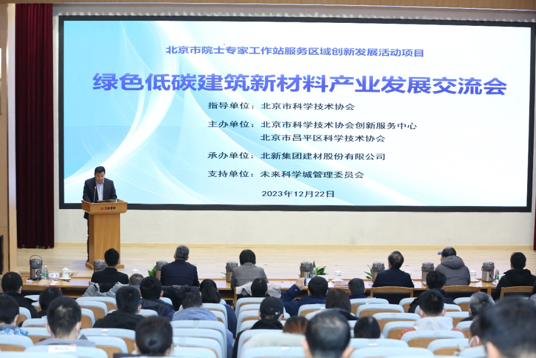 12月22日上午,由北京市科学技术协会指导,北京市科学技术协会创新服务中心、北京市昌平区科学技术协会主办,未来科学城管委会支持,北新建材承办的“绿色低碳建筑新材料产业发展交流会”在未来科学城北新中心召开。北京市昌平区政协副主席、昌平区科协主席李雪红,北新建材党委委员、副总经理杨正波发表致辞,北京工业大学龚先政教授代表中国工程院聂祚仁院士团队作主旨报告,来自北京科技大学、北京林业大学、湖北工业大学、中建材创新科技研究院的专家、学者作主题演讲,会议由北新建材总经理助理、科技与数字化部总经理祝伟丽主持。