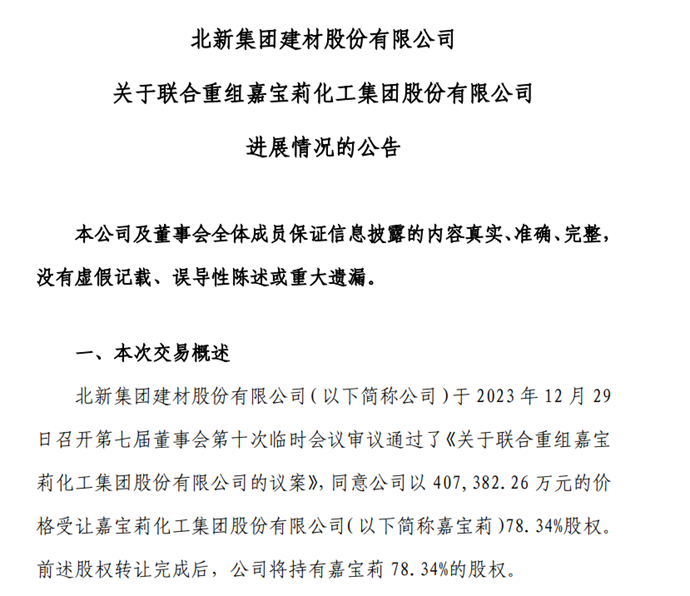 此前2023年12月29日晚,北新建材和嘉宝莉集团双双官宣:北新建材联合重组嘉宝莉。北新建材公告称,第七届董事会第十次临时会议审议通过了《关于联合重组嘉宝莉化工集团股份有限公司的议案》,同意公司以407,382.26万元的价格受让嘉宝莉化工集团股份有限公司78.34%股权。前述股权转让完成后,公司将持有嘉宝莉78.34%的股权。