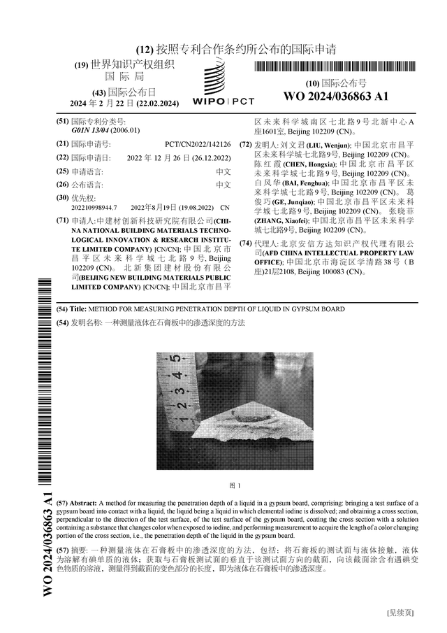 数据显示北新建材(000786)公布了一项国际专利申请,专利名为“一种测量液体在石膏板中的渗透深度的方法”,专利申请号为PCT/CN2022/142126,国际公布日为2024年2月22日。