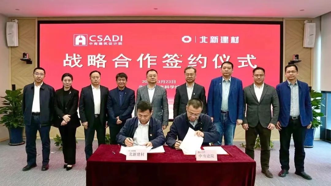 3月23日,北新建材与中南建筑设计院股份有限公司(以下简称“中南建院”)战略合作签约仪式在北新建材总部举行。中国建材股份党委委员,北新建材党委书记、董事、总经理管理,全国工程勘察设计大师、湖北省人大城乡建设与环境资源保护委员会副主任委员、首席专家李霆出席仪式并见证签约。北新建材总工程师董占波,中南建院党委委员、副总经理尹勤旺代表双方签署协议。