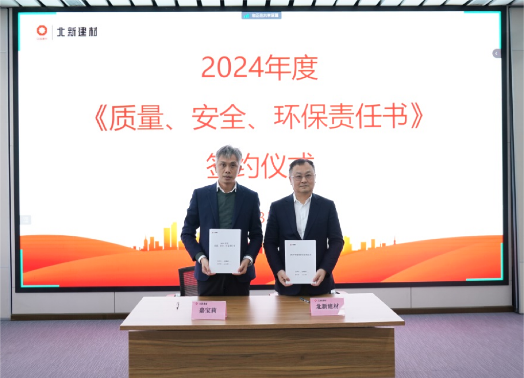 3月28日,北新建材与北新嘉宝莉经营目标责任书签约仪式在北新建材总部举行。中国建材股份党委委员,北新建材党委书记、董事、总经理管理代表管理层与北新嘉宝莉总经理仇东航签订了2024年度《经营目标责任书》和《质量、安全、环保责任书》。