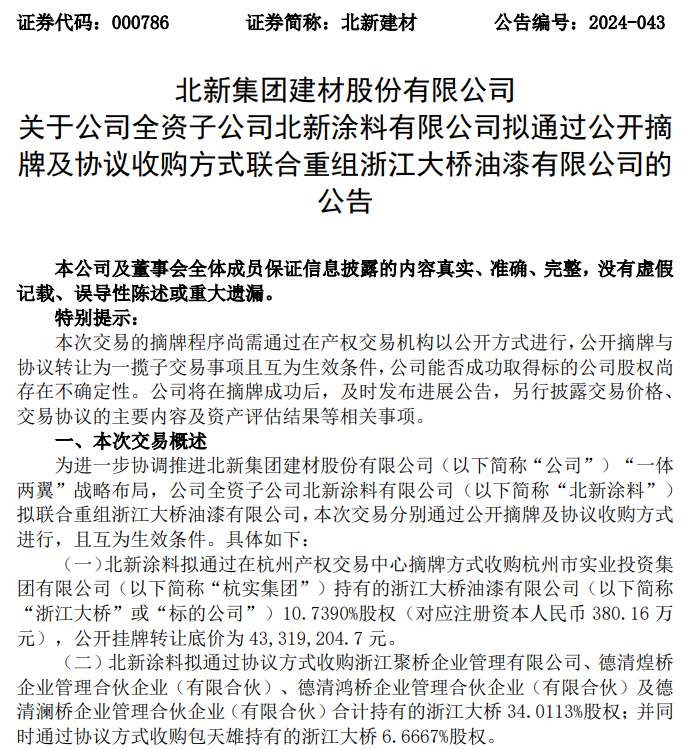 近日,央企中国建材旗下子公司北新建材(或称公司)发布公告称,为进一步协调推进公司“一体两翼”战略布局,公司全资子公司北新涂料拟通过公开摘牌及协议收购方式,联合重组浙江大桥油漆有限公司(下称“大桥油漆”)。本次交易分别通过公开摘牌及协议收购方式进行,且互为生效条件。