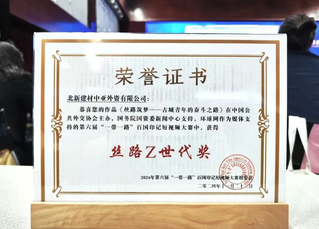 近日,北新建材中亚北新短视频作品《丝路筑梦——古城青年的奋斗之路》荣获第六届“一带一路”百国印记短视频大赛“丝路Z世代”奖。该大赛由中国公共外交协会主办,国务院国资委新闻中心、中国驻柬埔寨大使馆、柬埔寨驻华大使馆、中国驻奥克兰总领事馆支持,环球网作为媒体支持。