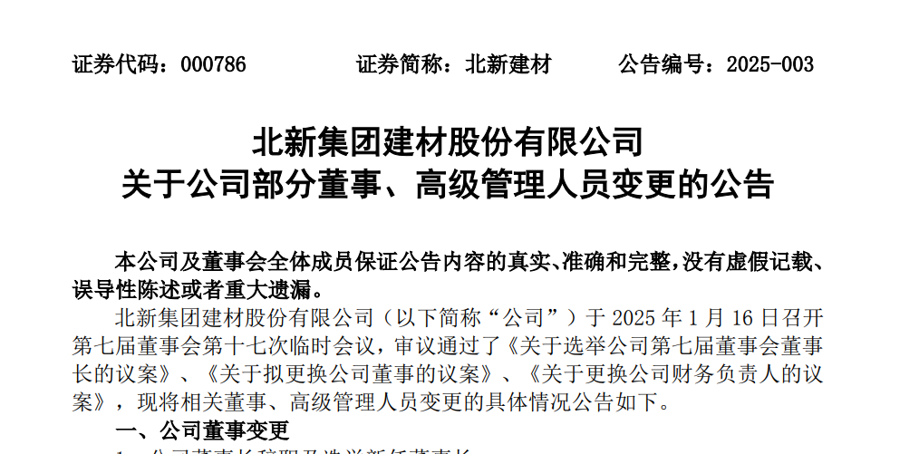 1月16日,北新建材(000786.SZ)发布公告,董事长薛忠民、副董事长贾同春及两名高级管理人员辞任。