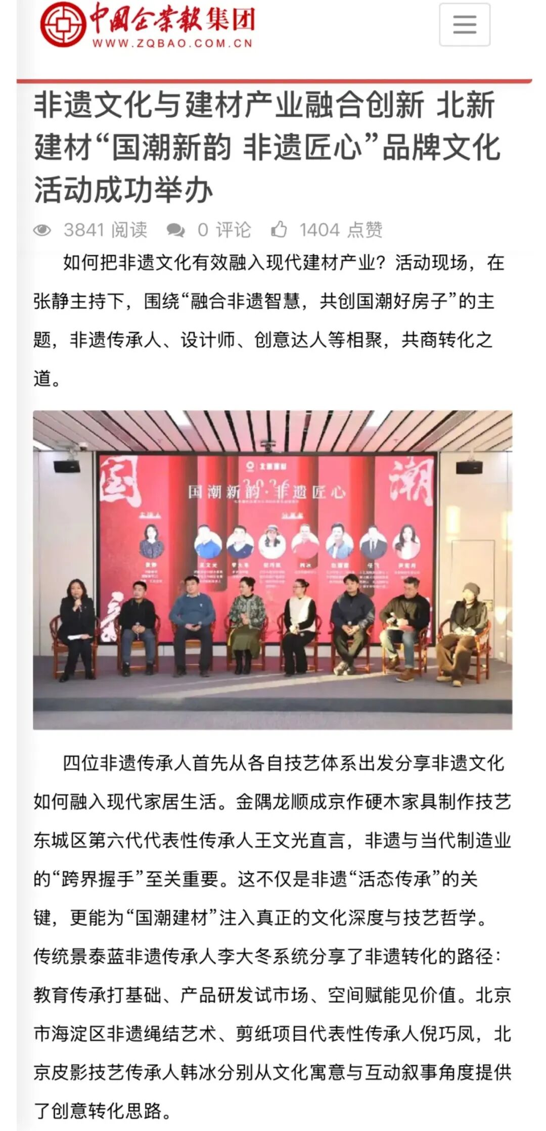 中国企业报从“非遗文化与建材产业融合创新”角度对活动进行全面报道,介绍了北新建材积极推动传统文化与产业升级深度融合,前瞻性地进行探索与实践,推进的品牌活动、产品创新与平台构建等契合市场需求,收获市场的积极认可,以文化“软实力”赋能企业发展。