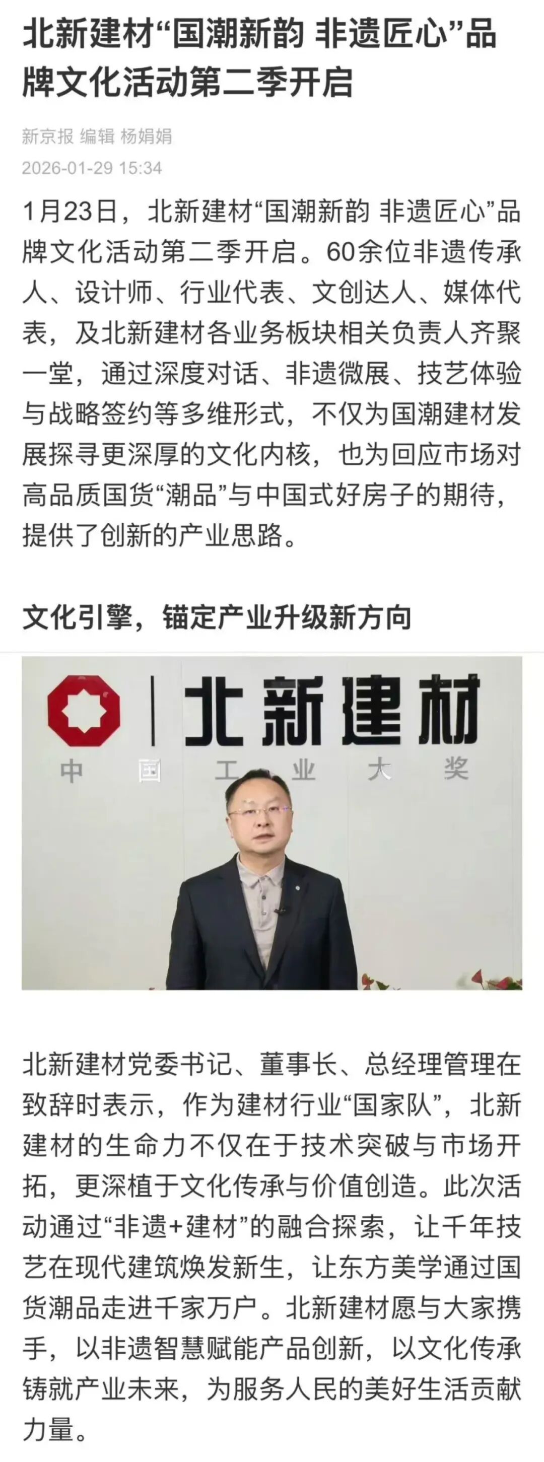 新京报聚焦北新建材“国潮新韵非遗匠心”品牌文化活动第二季,报道北新建材以“非遗+建材”融合为核心,通过深度对话、战略签约等多维形式,推动非遗技艺与现代建材创新结合,以文化赋能产品升级,带动国货潮品销售增长,开拓消费市场的实践。