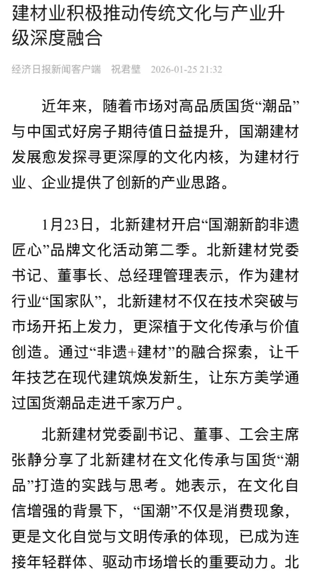 经济日报聚焦建材业积极推动传统文化与产业升级深度融合,报道北新建材作为建材行业“国家队”,不仅在技术突破与市场开拓上发力,更深植于文化传承与价值创造,通过“非遗+建材”的融合探索,为建材行业、企业提供了创新的产业思路。