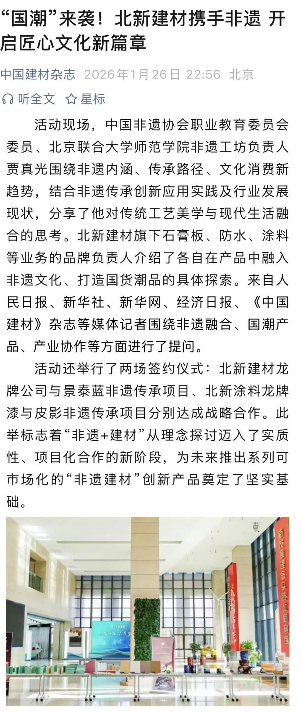 中国建材杂志从“北新建材携手非遗,开启匠心文化新篇章”出发,报道了北新建材举办第二季品牌文化活动,通过交流分享、非遗微展览、技艺体验及战略签约等多元化形式,探索国潮建材的文化内核与产业创新路径,推动高品质国货“潮品”与中国式“好房子”匠心落地。