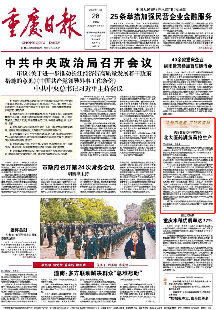 冲刺四季度,打好收官战!随着冬季感冒进入高发期,市场抗感染的需求日渐增多,当前,北大医药正铆足干劲扩产能抢生产,全力以赴冲刺全年目标任务的同时,持续保障着市场的用药需求。期间,公司满负荷的生产状态受到重庆日报、两江新区宣传部、新华网等多家媒体关注,于近期获得《重庆日报》头版报道。