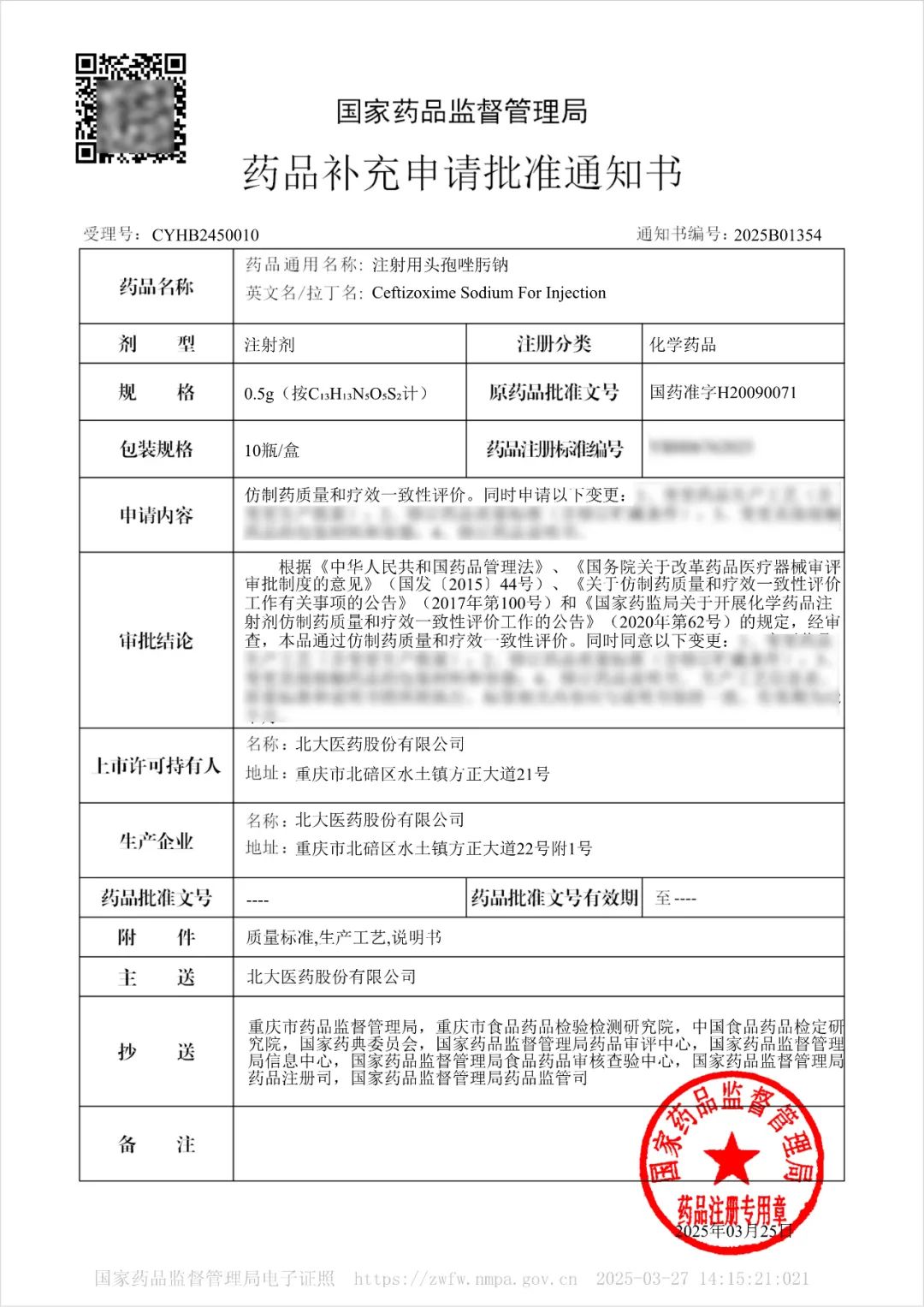 近日,北大医药获得国家药品监督管理局核准签发的注射用头孢唑肟钠(0.5g、1g)的《药品补充申请批准通知书》,这标志着该产品通过仿制药一致性评价,北大医药“头孢类”家族日渐壮大,抗感染核心领域再添战略成果,为2025年公司高质量发展擂响战鼓!