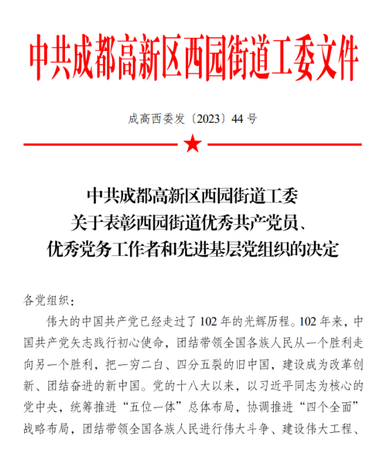 日前,中共成都高新区西园街道工委发布关于表彰西园街道优秀共产党员、优秀党务工作者和先进基层党组织的决定,华神科技党总支获得“先进基层党组织”荣誉称号,华神药业财务主管丁雁荣评“优秀共产党员”。荣誉的获得是对华神科技党总支一直以来积极履行社会责任、参加社区活动、推进党建工作的高度认可与鼓励。