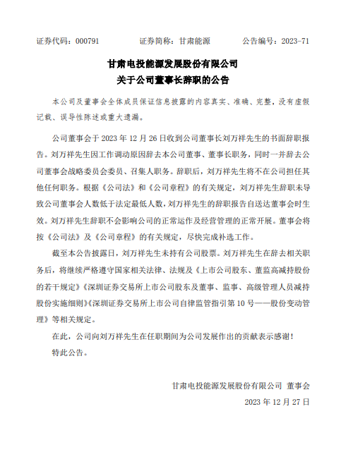 12月27日,甘肃能源发布公告称,刘万祥因工作调动原因辞去本公司董事、董事长职务,同时一并辞去公司董事会战略委员会委员、召集人职务。辞职后,刘万祥将不在公司担任其他任何职务。