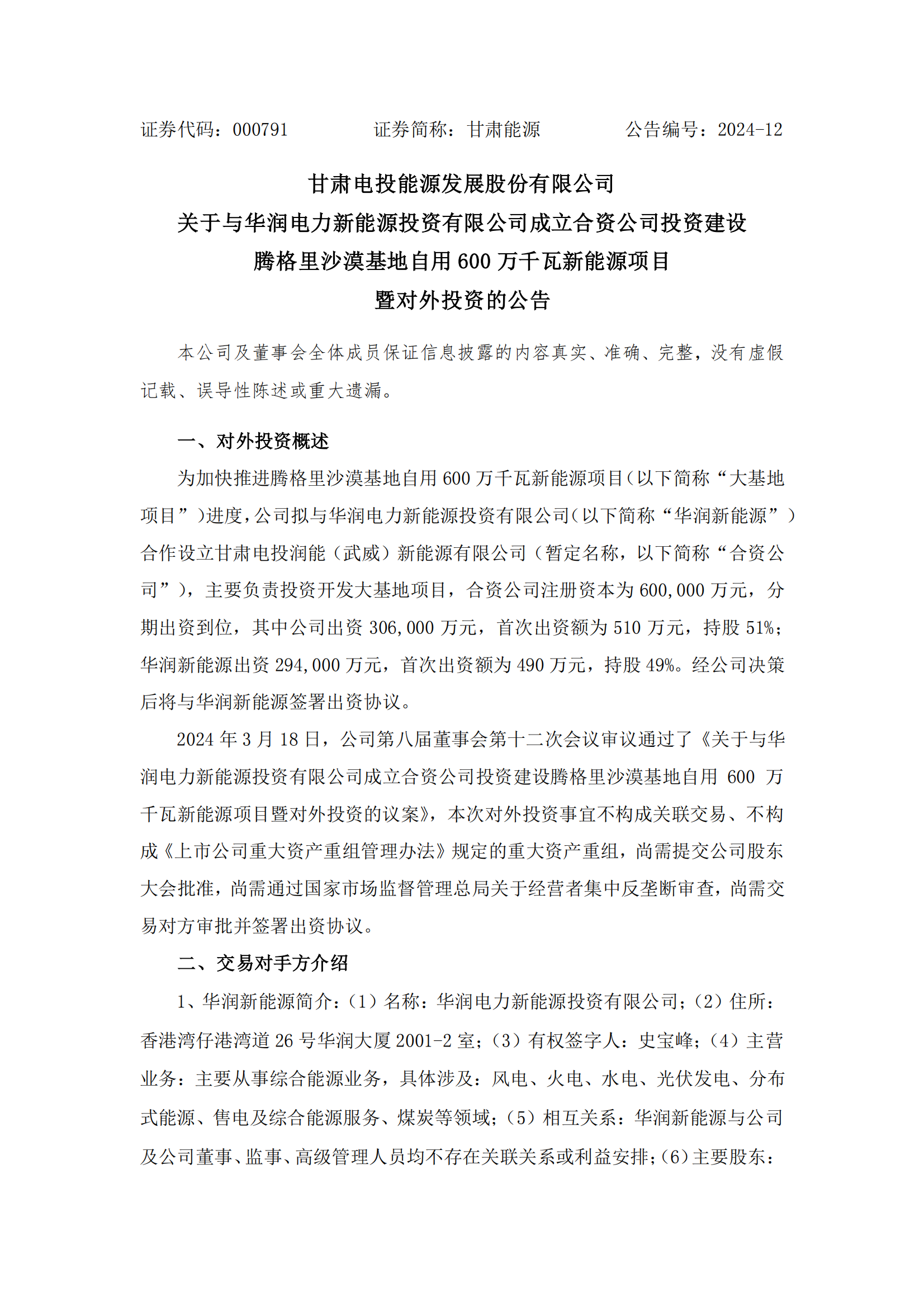 3月18日晚间,甘肃能源发布关于与华润电力新能源投资有限公司成立合资公司投资建设腾格里沙漠基地自用600万千瓦新能源项目暨对外投资的公告。