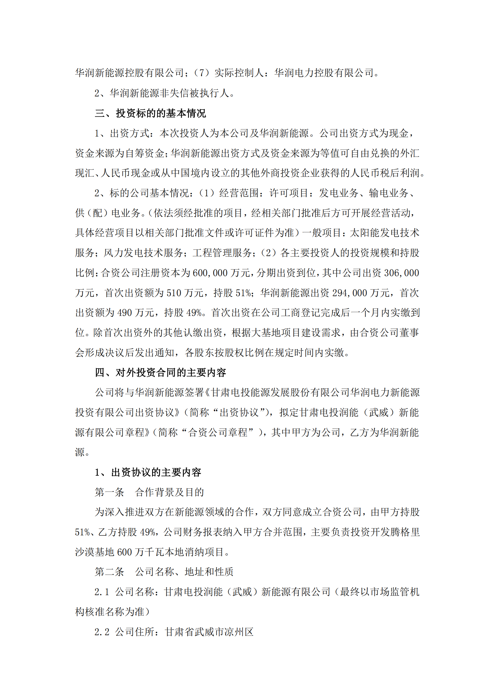 公告称,为加快推进腾格里沙漠基地自用600万千瓦新能源项目(简称“大基地项目”)进度,公司拟与华润电力新能源投资有限公司(简称“华润新能源”)合作设立甘肃电投润能(武威)新能源有限公司(简称“合资公司”),主要负责投资开发大基地项目,合资公司注册资本为60亿元,分期出资到位,其中公司出资30.6亿元,首次出资额为510万元,持股51%;华润新能源出资29.4亿元,首次出资额为490万元,持股49%。经公司决策后将与华润新能源签署出资协议。