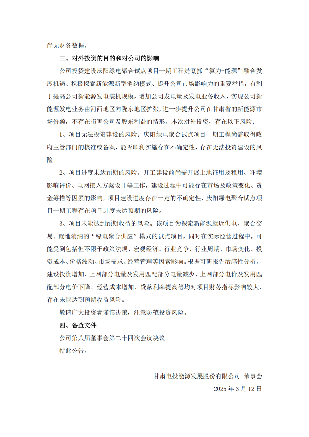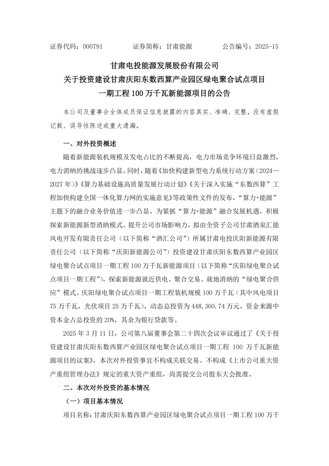 3月11日,甘肃电投能源发展股份有限公司(简称“甘肃能源”)发布《关于投资建设甘肃庆阳东数西算产业园区绿电聚合试点项目一期工程100万千瓦新能源项目的公告》。
