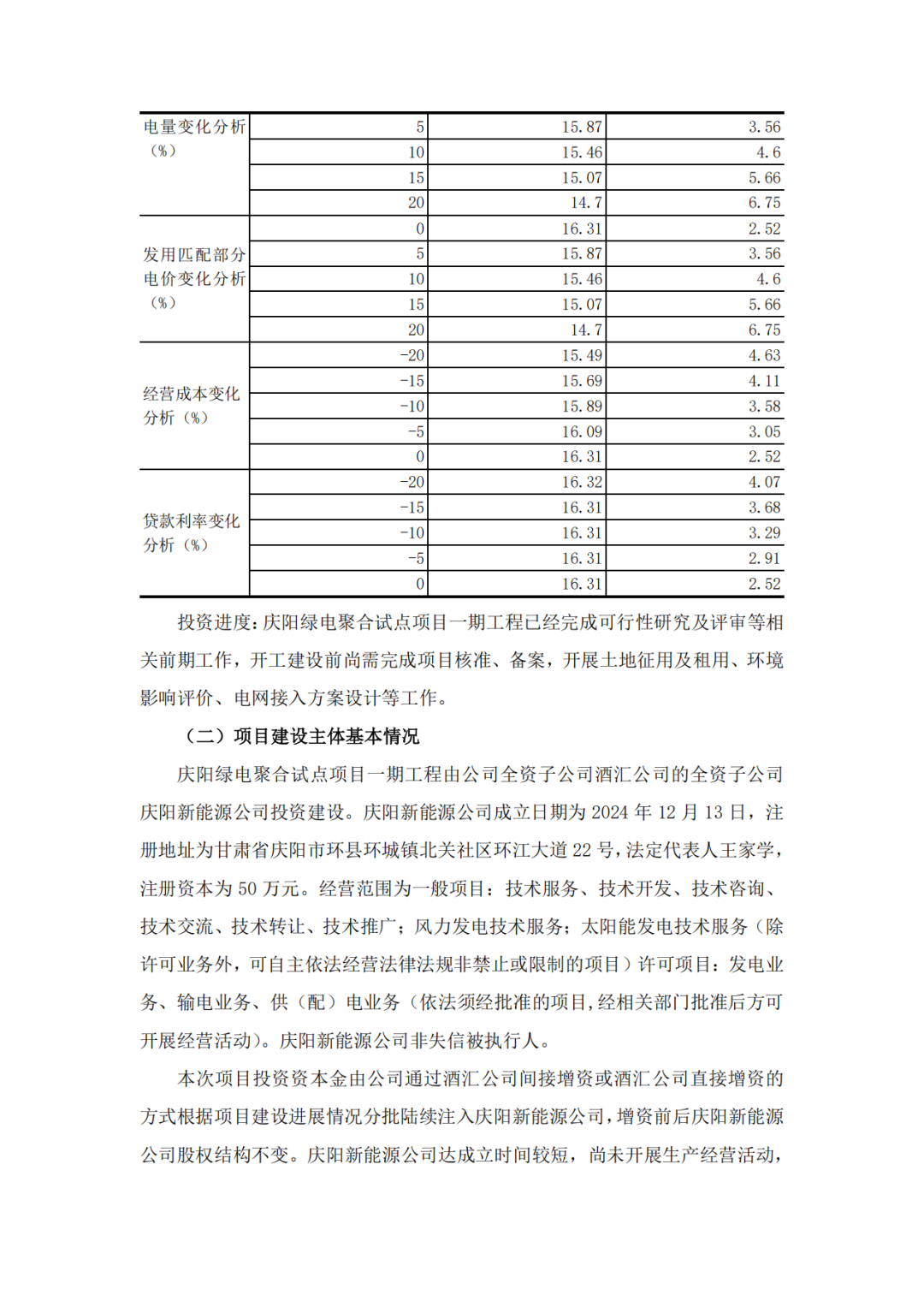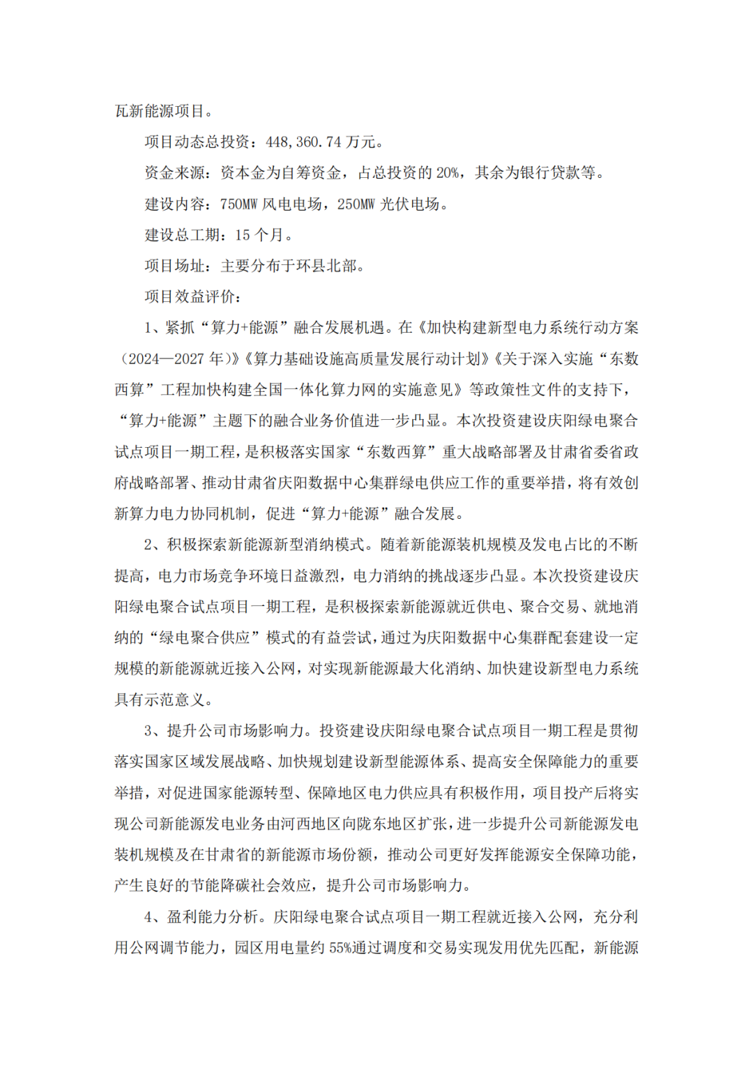 公告指出,拟由全资子公司甘肃酒泉汇能风电开发有限责任公司所属甘肃电投庆阳新能源有限责任公司投资建设甘肃庆阳东数西算产业园区绿电聚合试点项目一期工程100万千瓦新能源项目,探索新能源就近供电、聚合交易、就地消纳的“绿电聚合供应”模式。