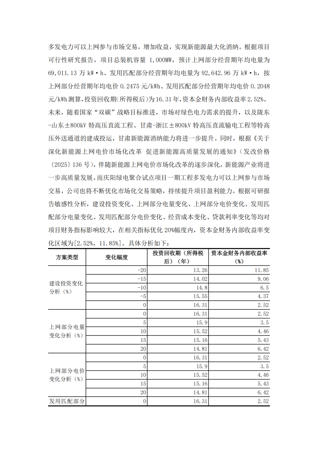 建设总工期为15个月,预计上网部分经营期年均电量为69011.13 万kW·h、发用匹配部分经营期年均电量为92642.96 万kW·h,按上网部分经营期年均电价0.2475元/kWh、发用匹配部分经营期年均电价0.2048元/kWh测算,投资回收期(所得税后)为16.31年,资本金财务内部收益率2.52%。