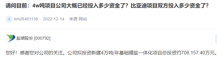 盐湖股份12月19日在深交所互动易平台表示,公司拟投资新建4万吨/年基础锂盐一体化项目总投资约708,157.40万元。