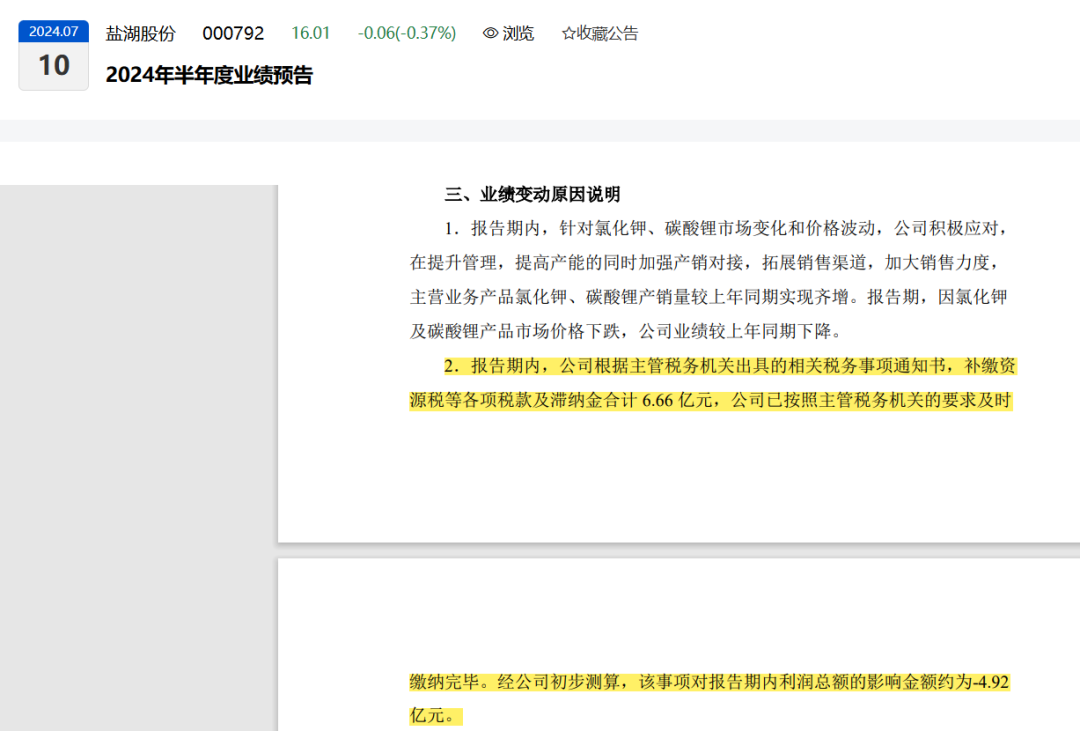 此外,根据蓝科锂业控股股东青海盐湖工业股份有限公司(以下简称“盐湖股份”)下发的通知,因盐湖股份自身需针对开发天然卤水资源进行资源税补缴,其需蓝科锂业将 2021 年至 2023 年向其支付的盐田及采卤系统维护费增值税税率由 6%调整为 13%;同时,其以 2023 年成锂卤水定价方式,回溯调整对蓝科锂业 2021 年至 2022 年的成锂卤水销售价格,并将调整后的 5.81 亿元(含税)采购卤水的费用差额入账至 2024 年上半年。综合考虑增值税可抵扣进项税额增加、卤水费用增加等共同影响,将导致蓝科锂业于报告期内减少利润总额 4.01 亿元。