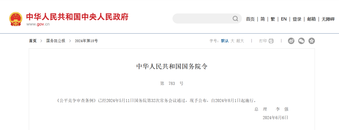 《公平竞争审查条例》已经2024年5月11日国务院第32次常务会议通过,现予公布,自2024年8月1日起施行。