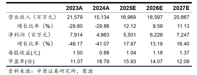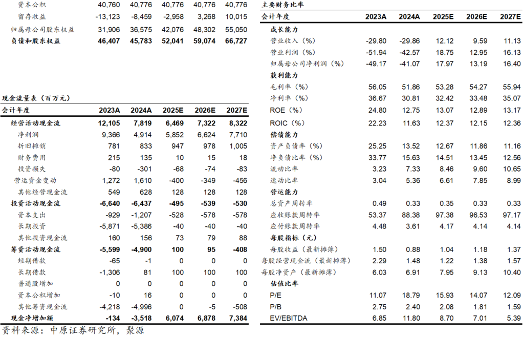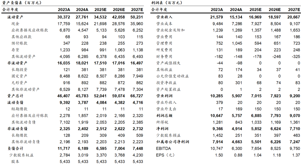 事件:公司公布2024年年报,2024年公司实现营业收入151.34亿元,同比下滑29.86%,实现归属母公司的净利润46.63亿元,同比下滑41.07%,扣非后的归母净利润44.01亿元,同比下滑49.56%,基本每股收益0.88元。公司同时公布一季度业绩预告,预计2025年一季度实现净利润11.3-12亿元,同比增长20.97%-28.47%,扣非后的净利润11.3-11.9亿元,同比增长 28.83%—35.68%。