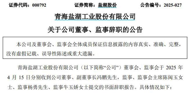 盐湖股份16日晚公告,公司董事、监事辞职。