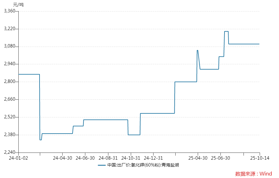 数据显示,2024年末青海盐湖氯化钾(60%粉)出厂价为2550元/吨,今年7月中旬时已经升至3200元/吨,此后一直维持在3100元/吨至今。